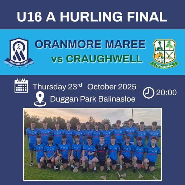 Best of Luck to the U16 Hurlers in the County Final on Thurs night in Duggan Park v Craughwell.