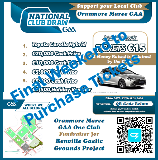 This is the final weekend to purchase tickets in the GAA National Club Draw.  Tickets are €15 and there are fabulous prizes to be won – 1st prize is a Toyota Corolla Hybrid car, 2nd prize €20,000 and a further 8 prizes for cash, holiday and All Ireland hurling and football final packages (includes hotel and tickets).