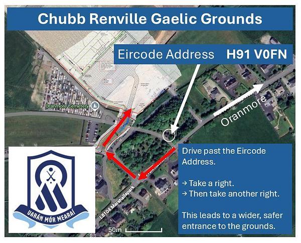 When driving to Chubb Renville Gaelic Grounds it is important that visitors use the appropriate entrance. The best, most safe entrance to use can be located just beyond the Eircode address - see graphic above for exact details.
